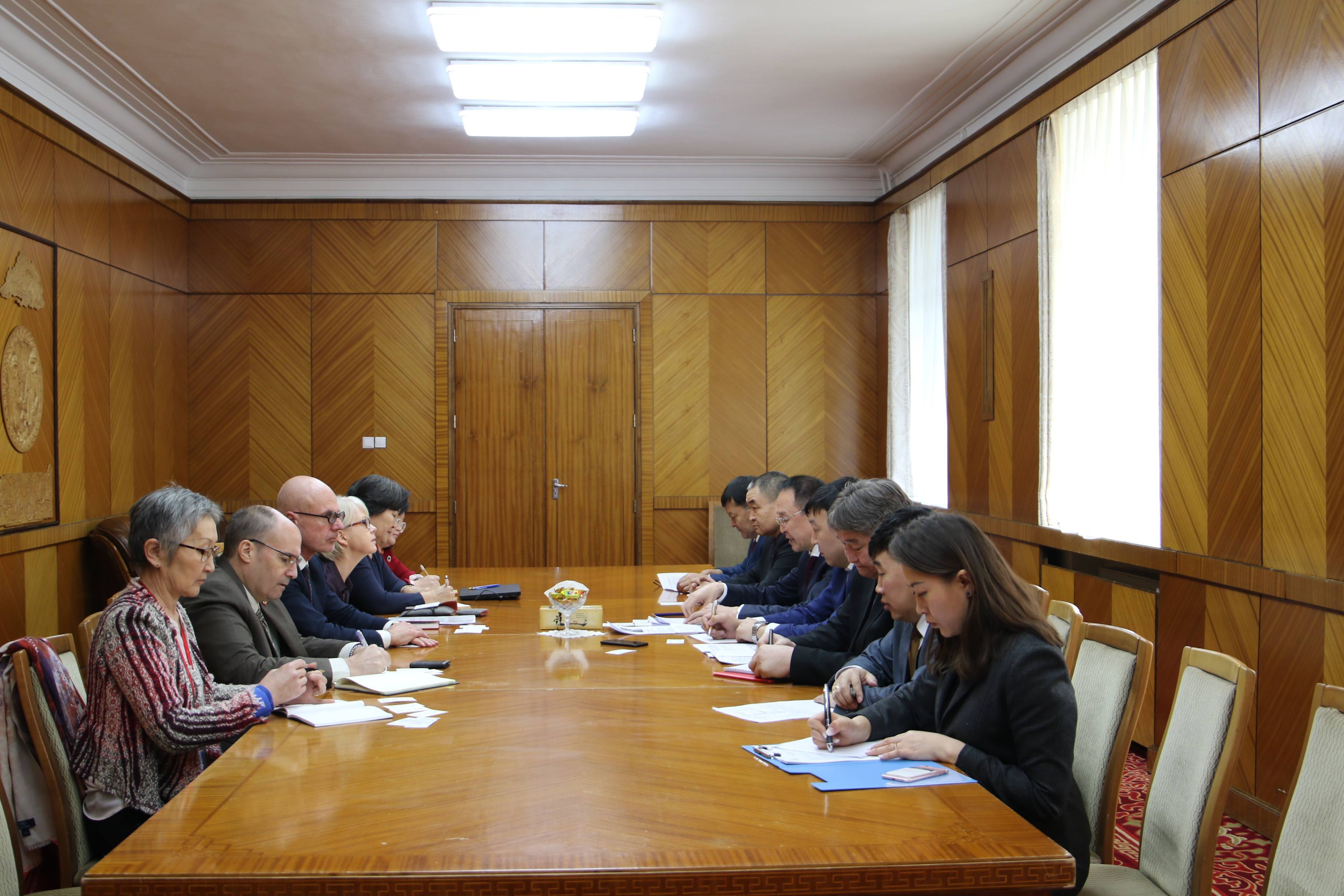 НҮБ-ын Хөгжлийн хөтөлбөрийн Суурин төлөөлөгч хатагтай Биата Транкман, Канад Улсаас Монгол Улсад суугаа Онц бөгөөд Бүрэн эрхт Элчин сайд Дэвид Спрул, Канад Улсын Элчин зөвлөх, Хөгжлийн хөтөлбөрийн тэргүүн Брюс Стийн нар өнөөдөр /2019.02.22/ Мо...