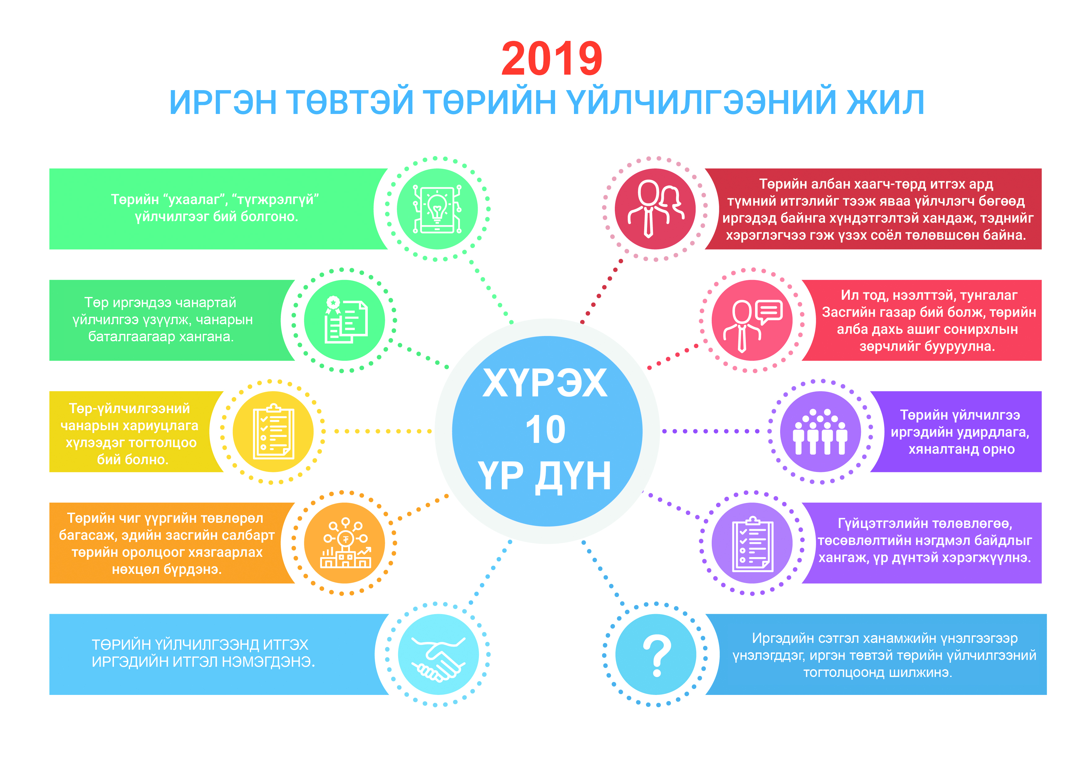 Монгол Улсын Засгийн газар төрийн албаны шударга байдал, иргэдээ дээдэлсэн төрийн үйлчилгээ, сахилга хариуцлагыг бэхжүүлэх нь хөгжлийн нэг тулгуур гэж тодорхойлсон. Иргэдийн хэрэгцээ, шаардлагыг ойлгож, түүнд нийцүүлсэн төрийн үйлчилгээг төлөвлөх шаардлагатай. Иймд 2019 оныг “Иргэн төвтэй төрийн үйлчилгээний жил”-ээр зарласан байна.