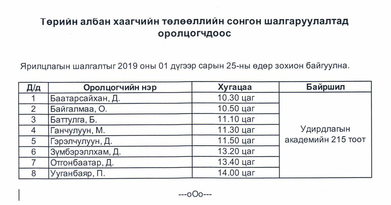 Шаардлага хангаж эцэслэн бүртгэсэн оролцогчдоос журмын 6.9, 6.10-т заасан ярилцлагыг 2019 оны 01 дүгээр сарын 25-ны өдрийн 10.30 цагт зохион байгуулахаар тогтжээ.