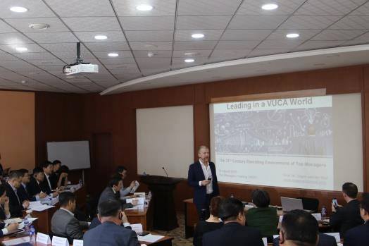 Төрийн албаны шинэчлэлийг эрчимжүүлэх зорилтын хүрээнд явагдаж байгаа төрийн албаны топ менежерүүдийг мэргэшүүлэх багц сургалтад Сингапурын Үндэсний их сургуулийн судалгаа хариуцсан дэд ректор, доктор профессор Зигер ван дер Вал, НҮБ-ын төслийн бодлогын зөвлөх Раэйн Оранж нар “21-р зууны VUCA ертөнцөд удирдагч байх нь”, Төрийн албаны менежерийн 7 ур чадвар” сэдвээр илтгэл тавьж, төрийн албанд тулгамдаж буй асуудлаар кейс хэлэлцүүлэг зохион байгуулж, харилцан ярилцаж санал бодлоо хуваалцлаа.