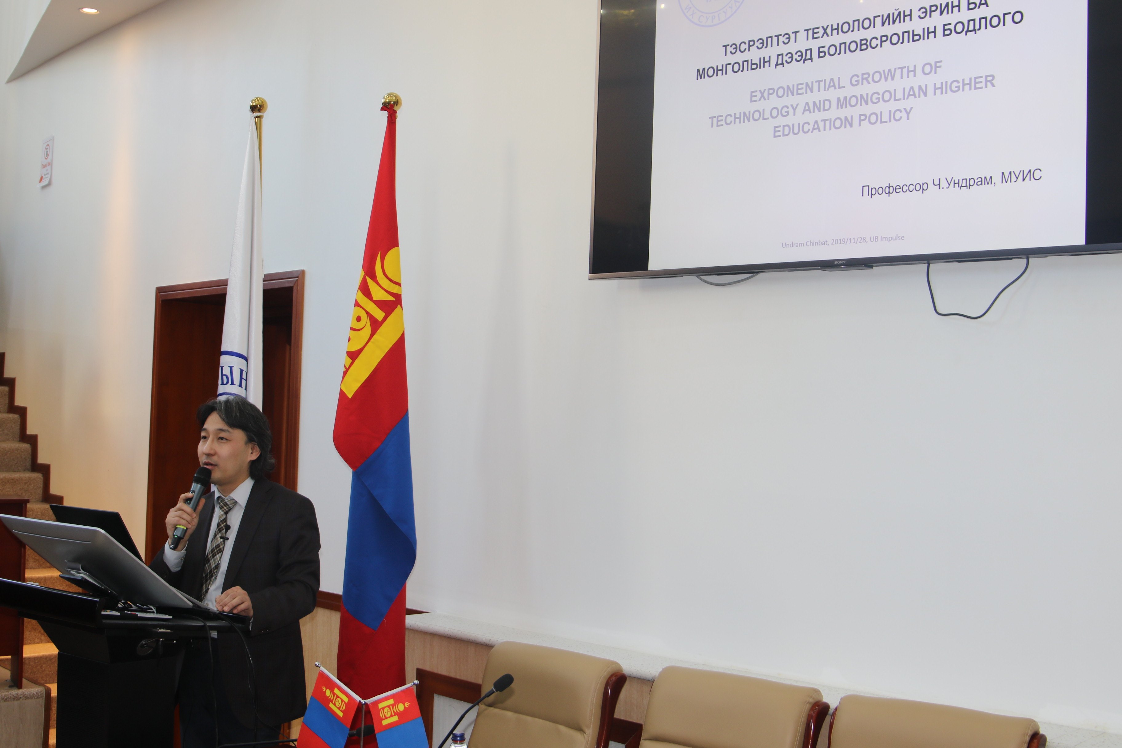 Харин хэлэлцүүлгийн илтгэгчээр МУИС-ийн санхүү, төлөвлөлт хариуцсан дэд захирал, эдийн засгийн шинжлэх ухааны доктор, профессор Ч.Ундрам ажилласан юм. Түүний энэ удаагийн илтгэлийн агуулгад аж үйлдвэрийн I-IV хувьсгалын түүхэн үйл явц, Монгол Улс аж үйлдвэрийн IV хувьсгальд оролцоход хэрхэн, яаж бэлтгэх, гаднын зарим улс орнуулаас боловсролын бодлогоо хэрхэн зөв, оновчтой төлөвлөж амжилтад хүрсэн зэрэг жишээ баримтуудыг илтгэлдээ тодотголоо.
