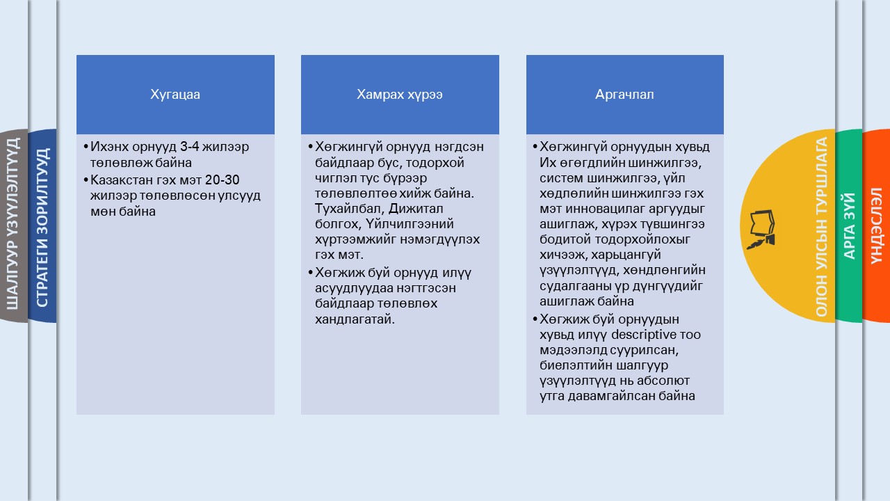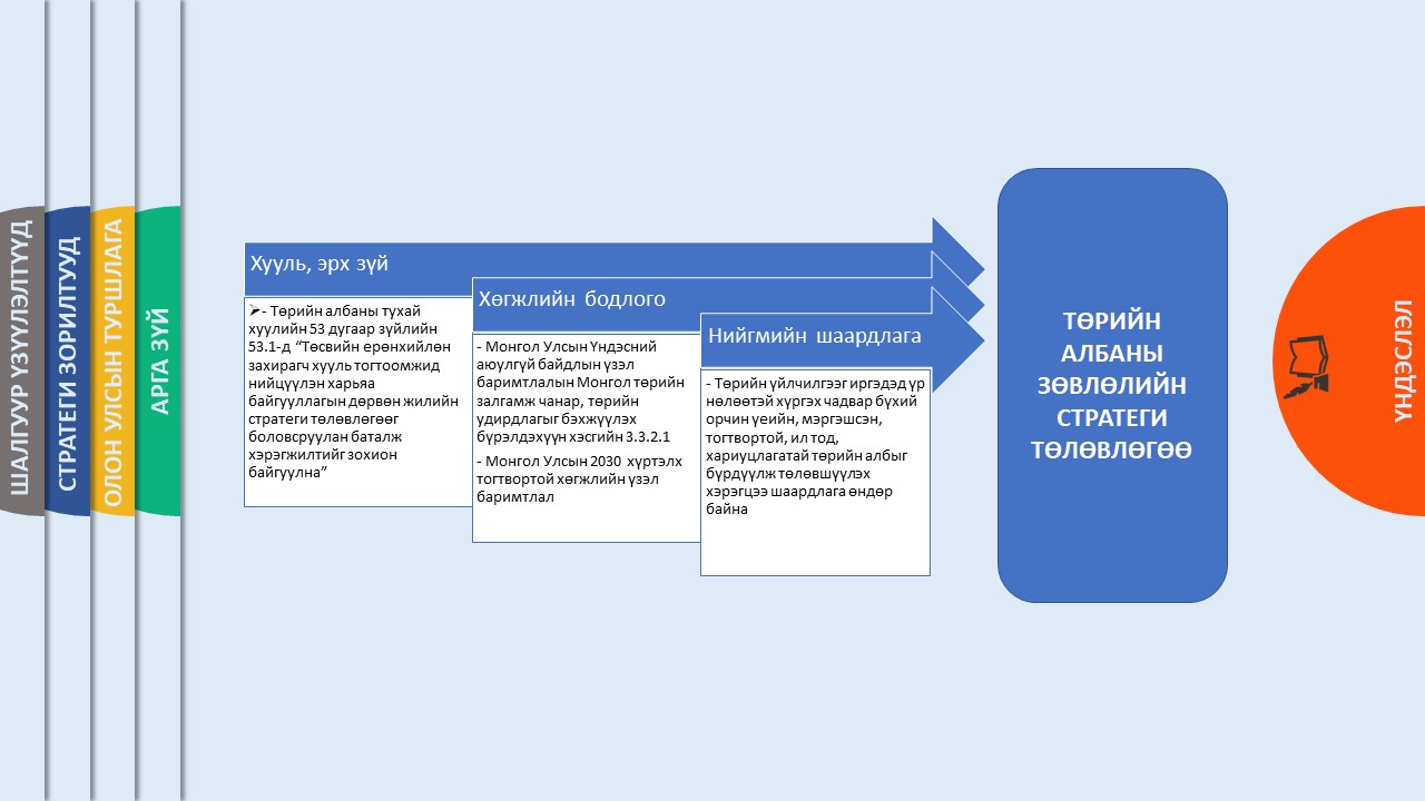 Төрийн албаны зөвлөлийн стратеги төлөвлөгөөг боловсруулахдаа гадаад орнуудын төрийн байгууллагын болон манай орны төрийн ба төрийн бус байгууллагуудын стратеги төлөвлөгөөний нийтлэг жишиг, туршлага, онолын чиг хандлагын талаар тоймлон судалж, төрийн албаны тухай хууль, холбогдох эрх зүйн акт, баримт бичгийг мэдээллийн эх сурвалж болгон ашиглажээ.