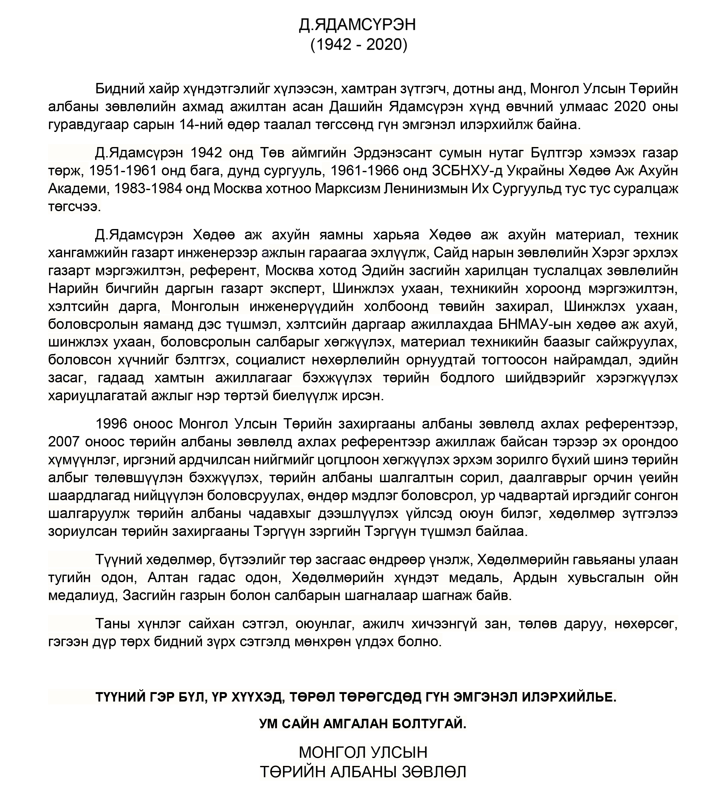 Бидний хайр хүндэтгэлийг хүлээсэн, хамтран зүтгэгч, дотны анд, Монгол Улсын Төрийн албаны зөвлөлийн ахмад ажилтан асан Дашийн Ядамсүрэн хүнд өвчний улмаас 2020 оны гуравдугаар сарын 14-ний өдөр таалал төгссөнд гүн эмгэнэл илэрхийлж байна.