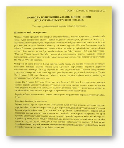 Монгол Улсын Их Хурлын 2004 оны 24 дүгээр тогтоолын хавсралтаар баталсан “Монгол Улсын төрийн албаны шинэтгэлийн дунд хугацааны стратеги”-ийн хэрэгжилтэд дүн шинжилгээ хийж, төрийн албаны шинэтгэлийг 2030 он хүртэл хэрэгжүүлэх дунд хугацааны стратегийн баримт бичгийн төслийг төрийн албаны хөгжлийн бодлого төлөвлөлтөөр мэргэшсэн үндэсний болон гадаадын экспертүүдийн оролцоотойгоор боловсрууллаа.
