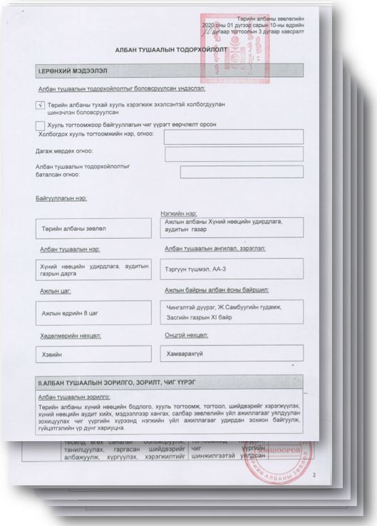 Төрийн байгууллагуудыг чиг үүргийн шинжилгээ хийлгэн албан тушаалын тодорхойлолт шинээр боловсруулах ажлыг улсын хэмжээнд зохион байгуулж, Төрийн албаны зөвлөлөөс 16.0 мянга гаруй албан тушаалын тодорхойлолтыг хянан хэлэлцэж, томилох эрх бүхий албан тушаалтанд батлах зөвшөөрөл олгосноор хуульд заасан болзол, шалгуур, мэргэжил, ур чадварын шаардлагыг хангасан иргэн шударга өрсөлдөөний зарчмаар төрийн албанд ажиллах, улмаар шатлан дэвших тогтолцоо бүрэлдэх суурь тавигдлаа.