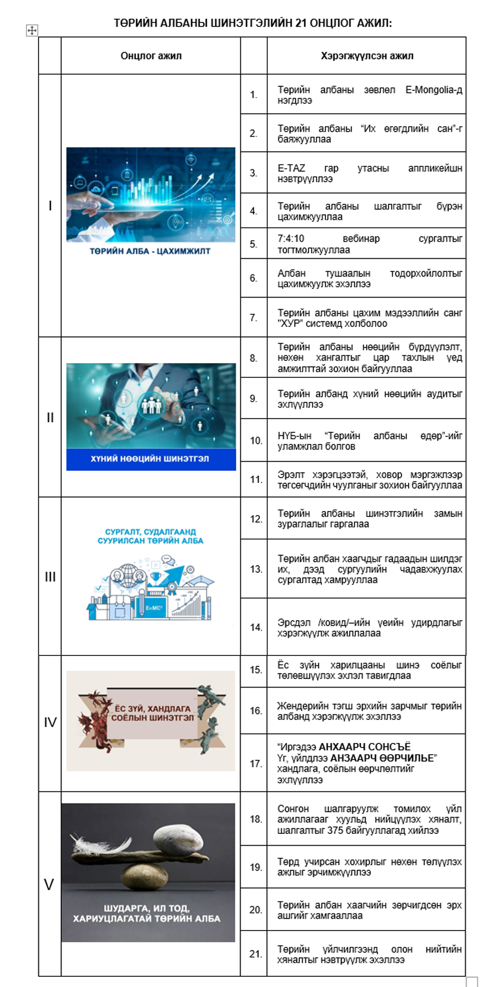 Төрийн албаны шинэтгэлийг хэрэгжүүлэх чиглэлээр стратегийн бодлого, төлөвлөлт, зохион байгуулалтын хүрээнд 2021 онд хийж гүйцэтгэсэн онцлох 5 онцлох ажлын 21 хэрэгжүүлсэн онцлог ажлуудаа тодорхойлов.